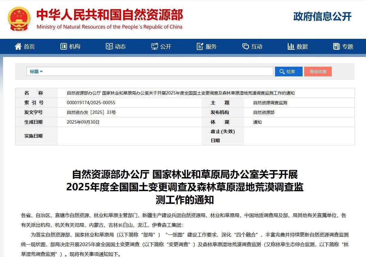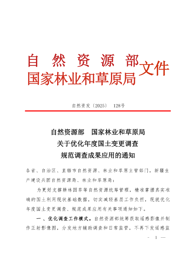 1、《自然资源部办公厅 国家林业和草原局办公室关于开展2025年度全国国土变更调查及森林草原湿地荒漠调查监测工作的通知》(自然资办发〔2025〕33号)